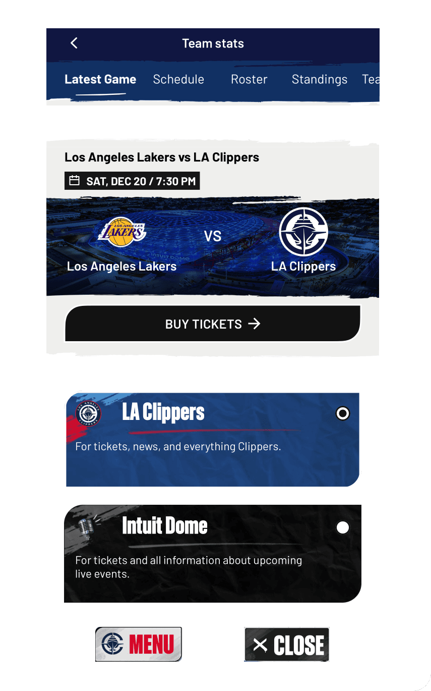 Our primary goal was finding the "sweet spot" between two extremes: the raw, street-level energy of the Clippers brand and the polished, high-tech nature of the venue. Furthermore, we had to ideate a dual-identity UI. The app needed the flexibility to pivot between a "Clipper-centric" theme and a neutral, "Event Mode" for concerts and shows, all while maintaining a consistent user experience.